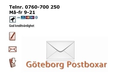 Ring eller sms:a. Vänligen lämna ett meddelande vid ej svar till röstbrevlådan. Tel. 0760-700 250 (vardagar må-fr 09.00-21.00) Mail. info@goteborgpostboxar.se